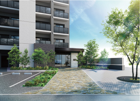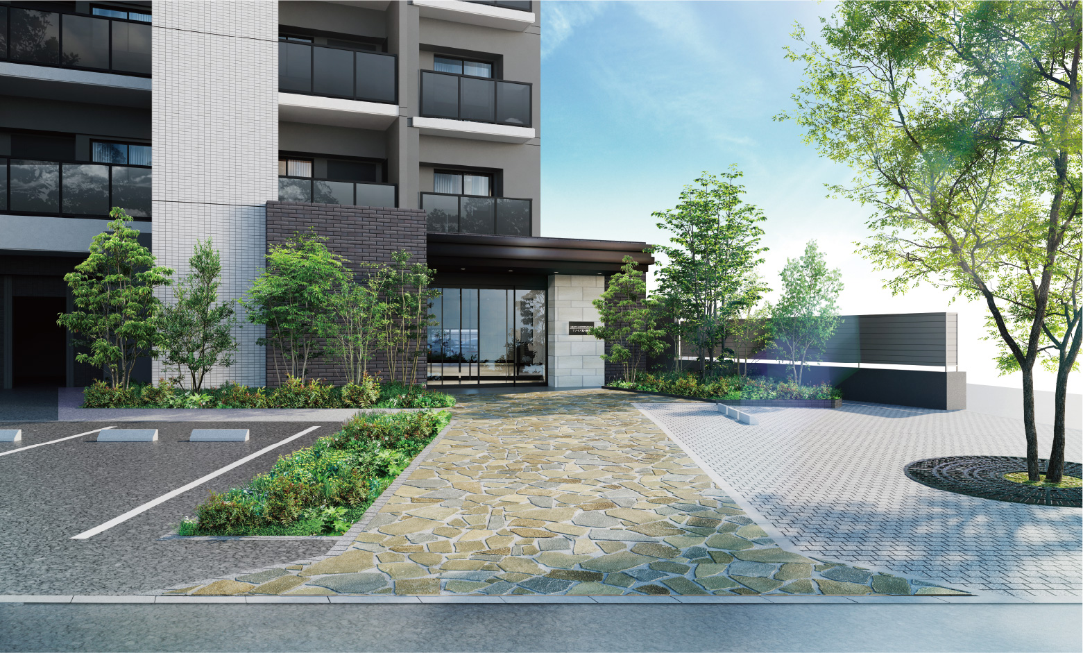 緑豊かな立地に誕生することを意識し、常緑樹や落葉樹を組み合わせた潤いの植栽計画にこだわりました。豊かな緑が外観の足元を引き締め、美しい佇まいを演出します。