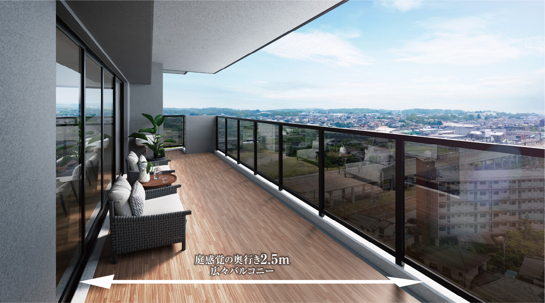 アウトドアリビングという発想から生まれた、奥行き2.5mの広々バルコニー。