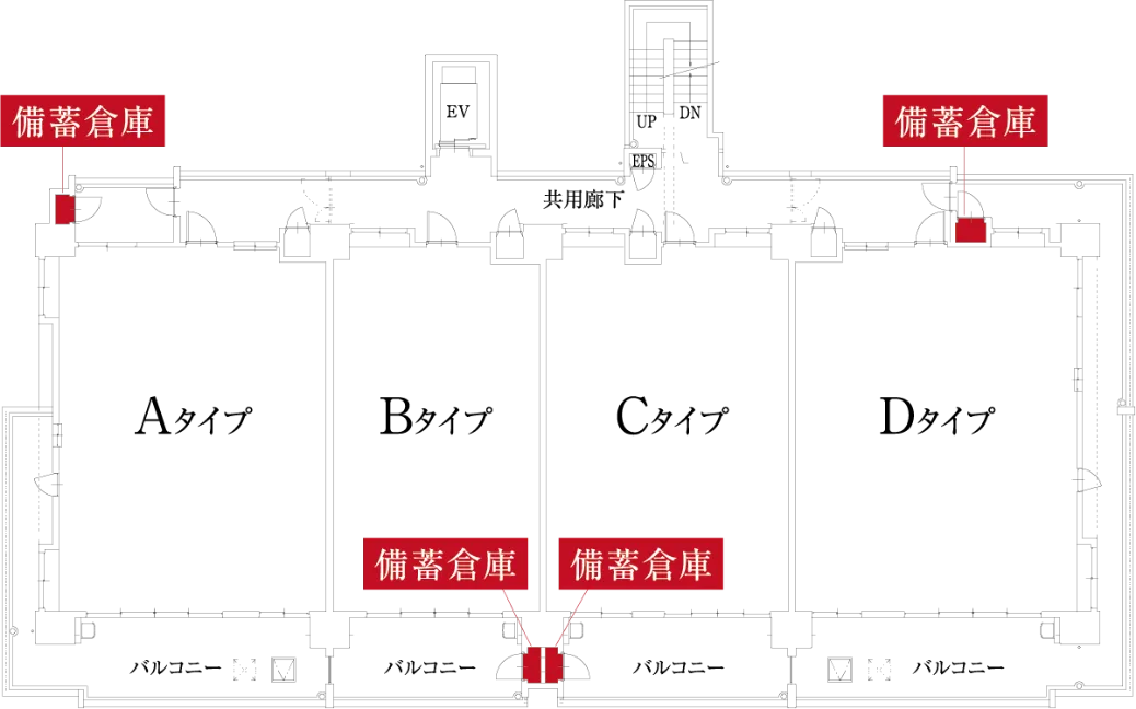 1F共用部と角住戸に備蓄倉庫を完備。1Fの備蓄倉庫には、災害時用の食料・生活用品等の防災物資を保管します。(予定)