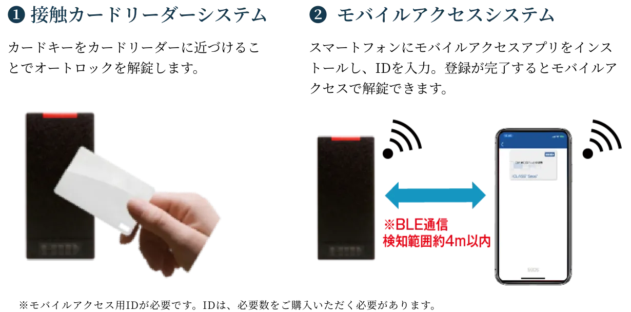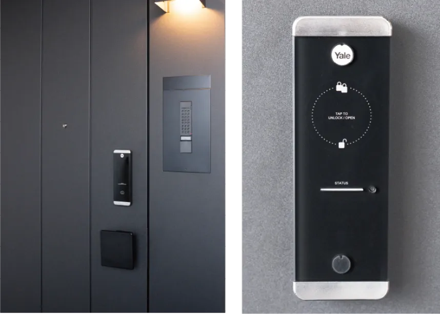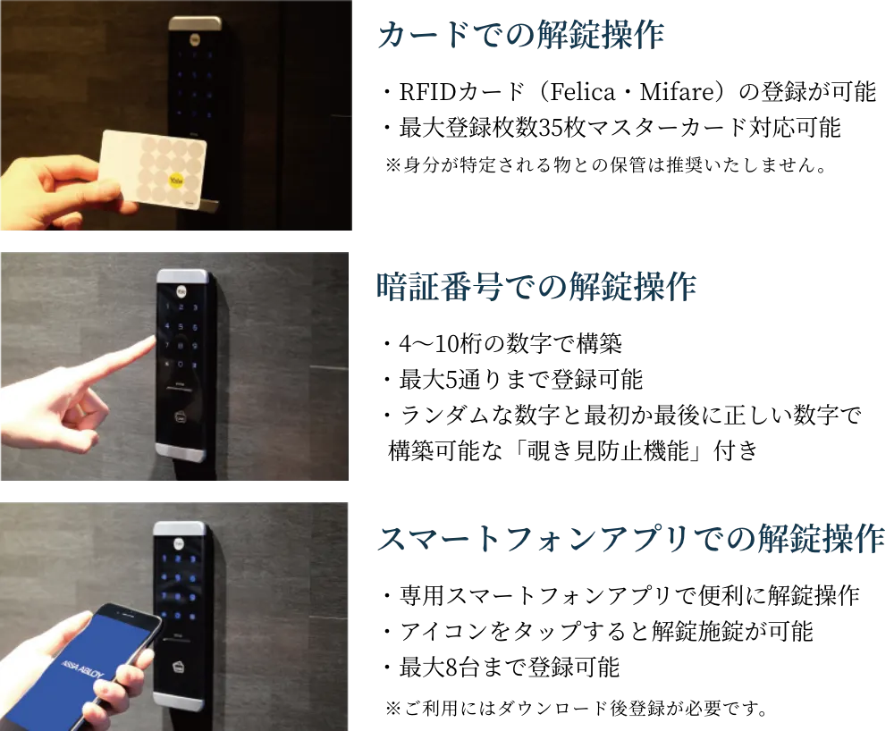 財布やカードケースの中にスマートに携帯できる、ホテルのようなカードキーを採用。エントランスでは、スマートフォンによるモバイルアクセスでの解錠も可能です。また、各住戸の玄関ドアでは、カードに加えて、暗証番号やスマートフォンアプリでの解錠もできます。