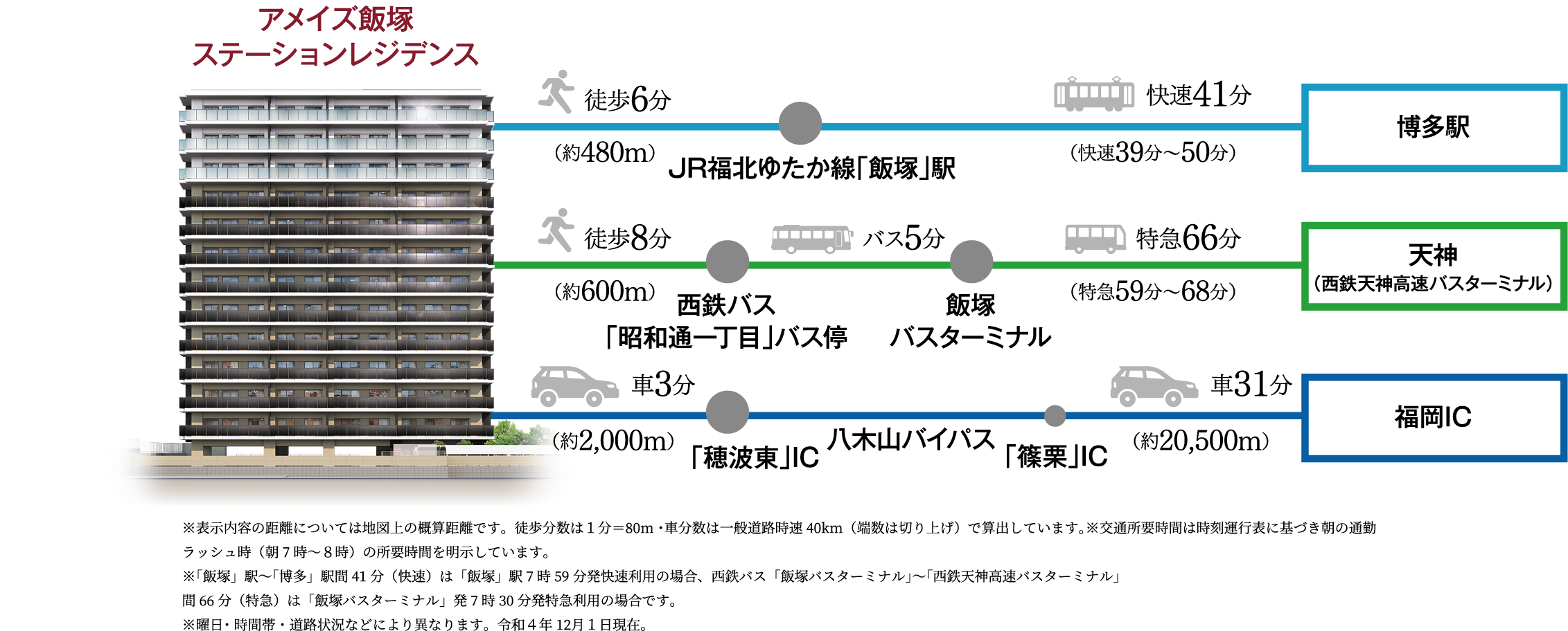 街づくりが進むエリアを通って、JR「飯塚」駅へ徒歩6分の近さです。快速列車を使えば、JR「博多」駅へ41分(快速39分~46分)。博多駅から天神へ、空港へ、地下鉄でスピーディにつながり、毎日の通勤や休日のレジャーをサポートします。