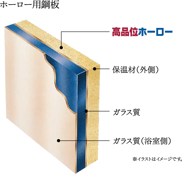 厚さ16mmの保温材と高品位ホーローでつくられた浴室パネルだから断熱性はもちろん、耐久性にも優れています。また、浴室パネルのホーロー部分に直接金具を打ち込んでしっかりと固定しているので長年の使用に耐える丈夫な構造です。