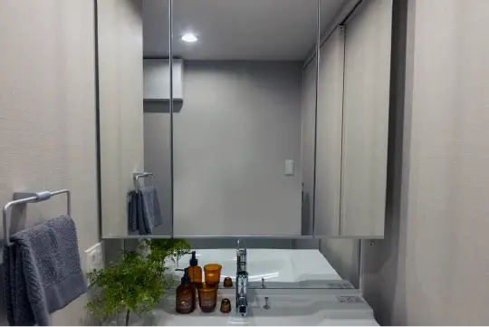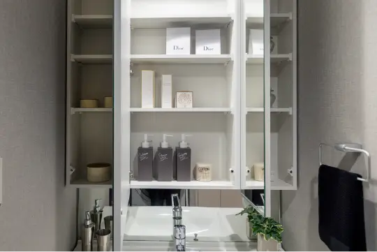 三面鏡には、たっぷりの収納スペースを設けています。化粧小物や洗面道具などを整理でき、スッキリとした空間を保ちます。