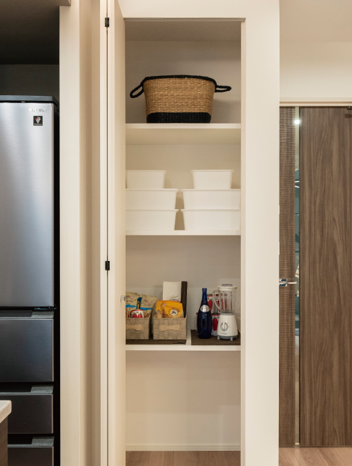 キッチンに設けたパントリーは、買置き品や保存食、大型の調理器具などをたっぷり収納できます。キッチンをすっきり美しく保てる工夫のひとつです。