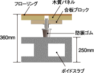 フローリングとコンクリートスラブの間に層を設けて二重構造にすることで、足音など生活音の上下階への影響を和らげます。