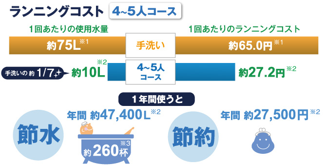 ※1【手洗い】<食器40点、小物(はし5膳、スプーン・フォーク各5点)はしは1膳=2点とする/水温約20℃>合計60点を約10Lのお湯(約40℃)でつけ置き。食器・小物に使う洗い&すすぎ水量は約40℃のお湯にして食器:1.35L/点、小物0.55L/点使用する。洗剤は1回あたり315ml入り164円(税込)(日本電機工業会調べ)を9.6ml使用 ※2 浅型タイプ【4~5人コース運転時】食器40点、小物(はし5膳、スプーン・フォーク各5点)はしは1膳=2点とする/水温約60℃、標準コース(洗い~乾燥で仕上げた場合。洗剤は1箱詰替え用600g入り475円(税込)(当社調べ)を5g使用。★ランニングコスト目安単価(税込)●電力料金目安単価31円/kWh(税込)【2022年7月改定】(家電公取協調べ)●ガス料金(都市ガス)222円/m3(税込)(当社調べ)●水道料金137円/m3(税込)、下水道使用料125円/m3(税込)(日本電機工業会調べ)。[2024年1月現在]※7標準運転時、送風口から約10cm離れて計測。 ※3 浴槽の容量180Lの場合