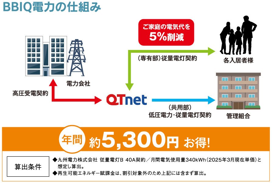 「アメイズ串木野ビューテラス」は、マンション高圧一括受電システム「BBIQ電力」で電気料金の削減を実現。「BBIQ電力」とは、マンション一棟丸ごとの契約にすることで、単価の安い高圧電力契約を結ぶことを可能にしたもの。従来の地域電力会社と各入居者さまとの契約に比べて、電気代を安くするサービスです。