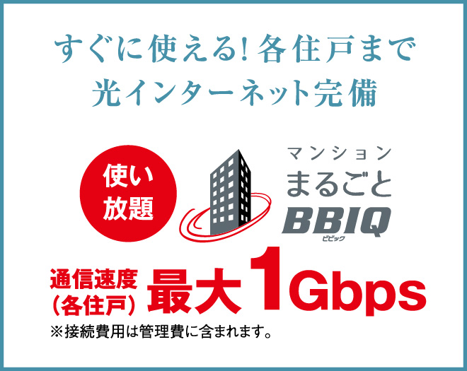 九州電力グループのQTnetが提供するBBIQ(ビビック)光インターネットサービスを標準装備。マンションの共用部の引込から各住戸まですべてに光ファイバーを導入しているため、光の通信品質を落とすことなく、快適なインターネットをご利用いただけます。