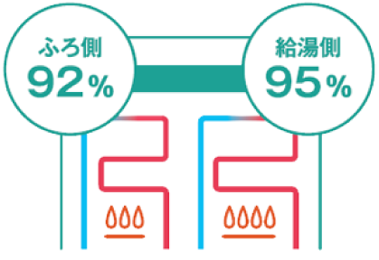 給湯に加え、ふろの追いだき側にも二次熱交換器を搭載しているので、追いだき時も高効率を実現しています。