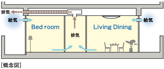 低風量の連続運転で常に新鮮な空気を取り入れ、室内の汚れた空気や湿気を排出。各居室を健やかな空気で満たします。