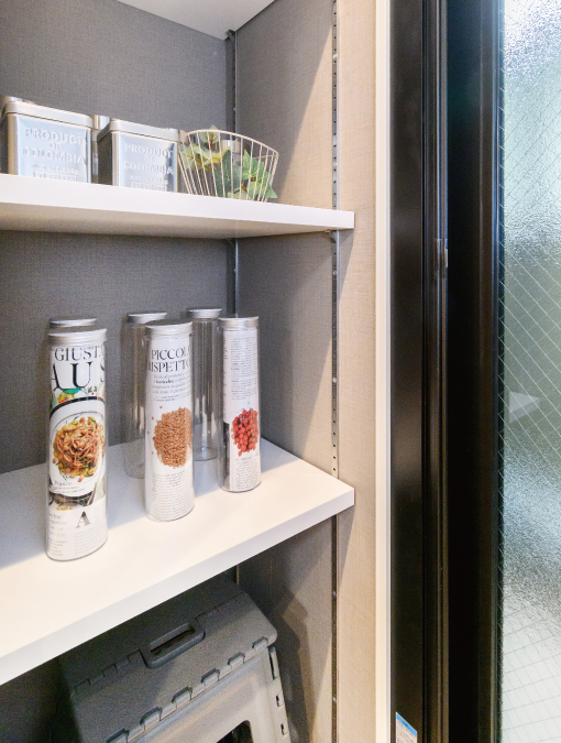 キッチンに設けたパントリーは、買置き品や保存食、大型の調理器具などをたっぷり収納できます。キッチンをすっきり美しく保てる工夫のひとつです。