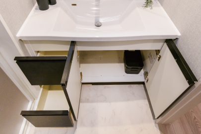 三面鏡には、たっぷりの収納スペースを設けています。化粧小物や洗面道具などを整理でき、スッキリとした空間を保ちます。