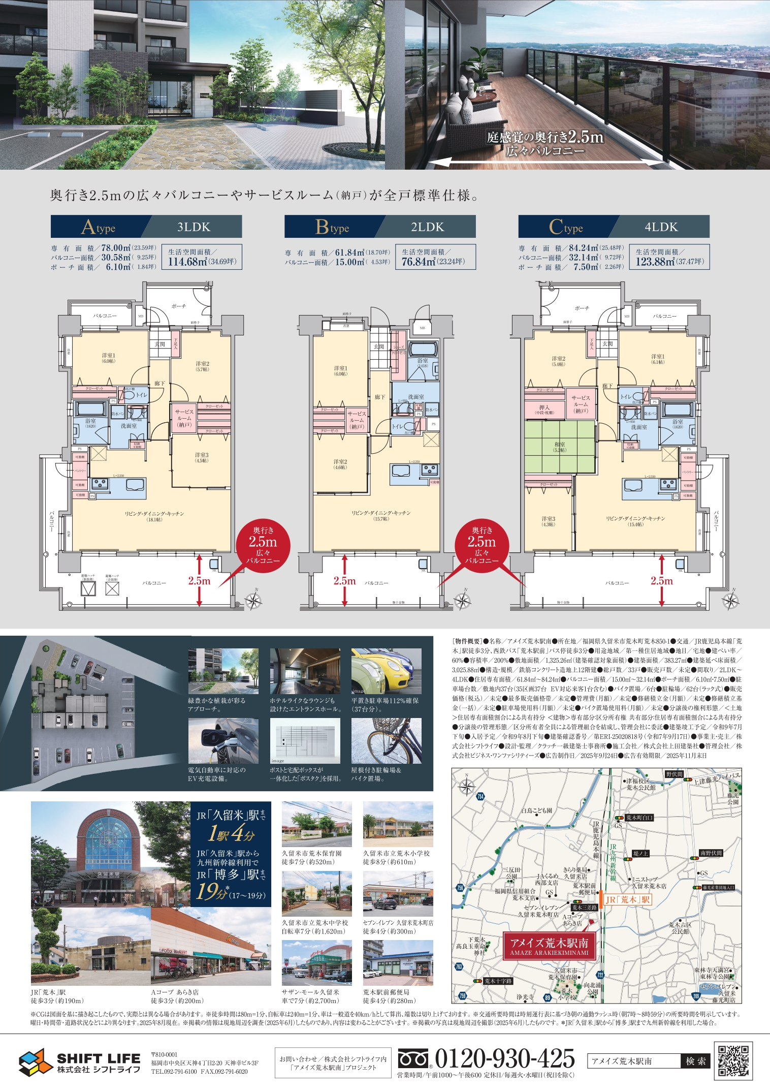 JR「荒木」駅まで徒歩3分、JR「久留米」駅へはわずか1駅4分。