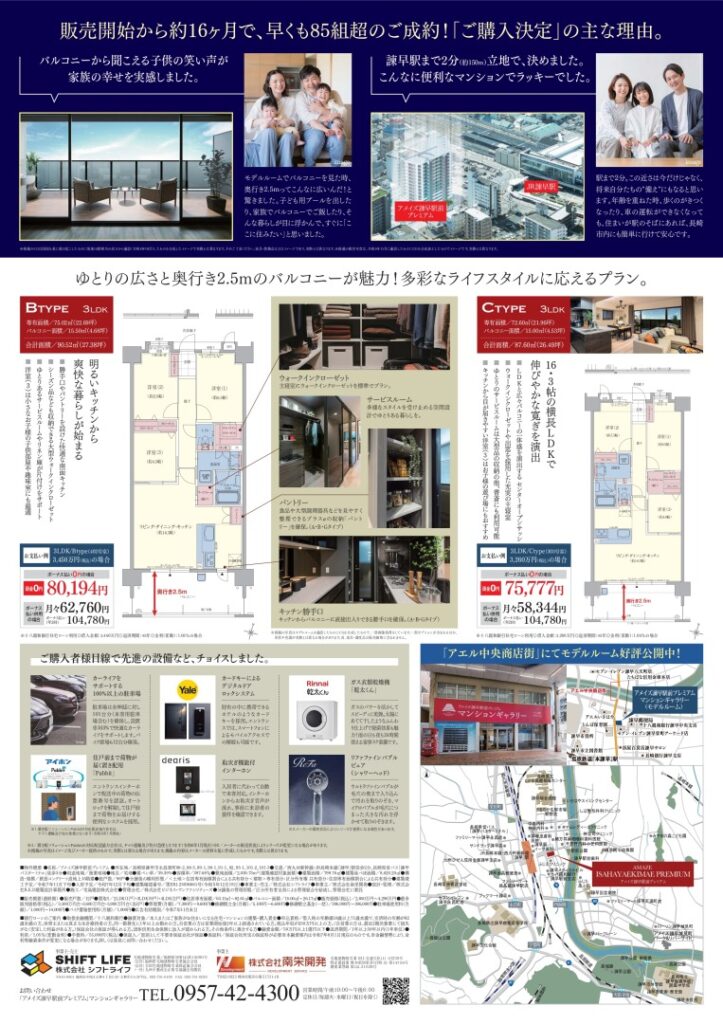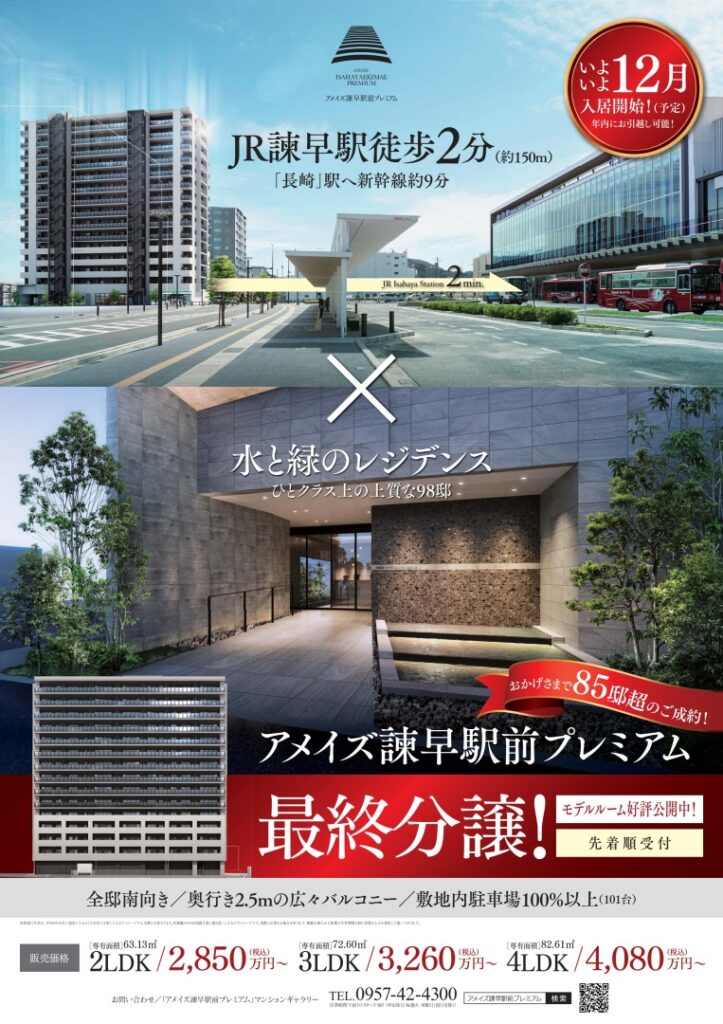 販売開始から約16か月で、早くも85組超のお客様にご成約をいただきました「アメイズ諫早駅前プレミアム」は、現在最終分譲中です。